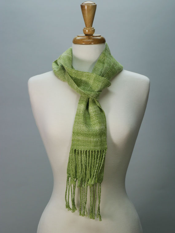 Light Green and Natural, 100% Cotton, Approximately 69″ x 4″. Hand dyed, Handspun and Handwoven by Joanne Littler, Pine Ledge Fiber Studio, Fairfax, VT.