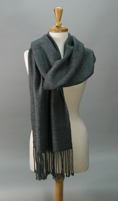 Shawl, 70% Merino Wool / 30% Tussah Silk. Size: approximately 72″ x 17″, Color name: McKenzie. Handspun and Handwoven by Joanne Littler, Pine Ledge Fiber Studio, Fairfax, VT. $435.